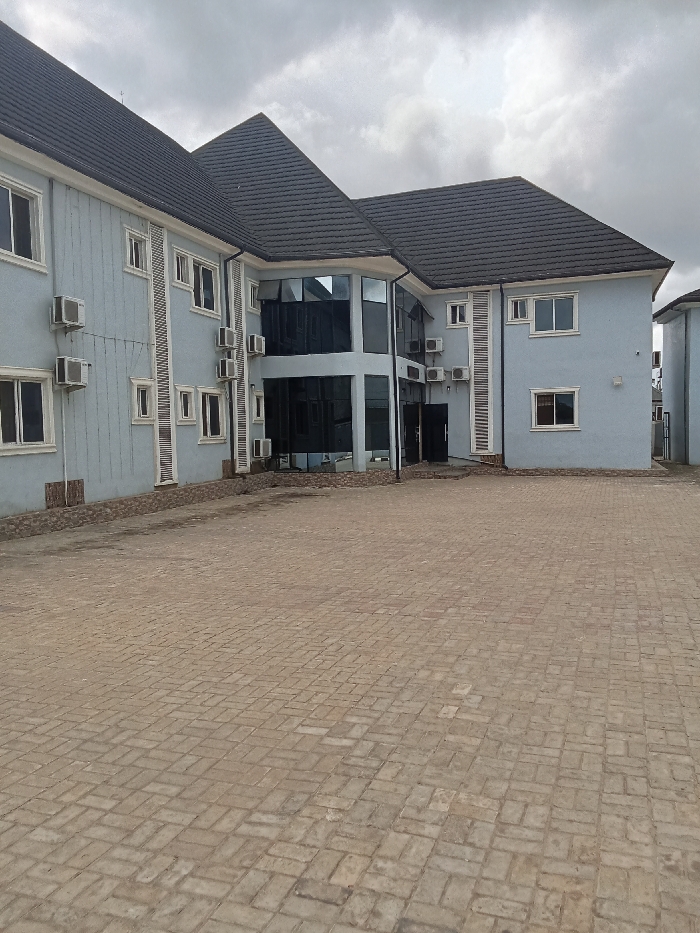 light blue, two-story building with a brown tiled roof in Ujevwu, Nigeria