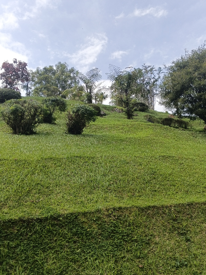 A vibrant green hillside is neatly terraced. Lush grass covers the slopes, punctuated by shrubs and trees at the summit. The trees include a mix of broadleaf and fern-like varieties. The sky above is a pale blue with wispy clouds. The bottom of the hillside is hidden by more vegetation.