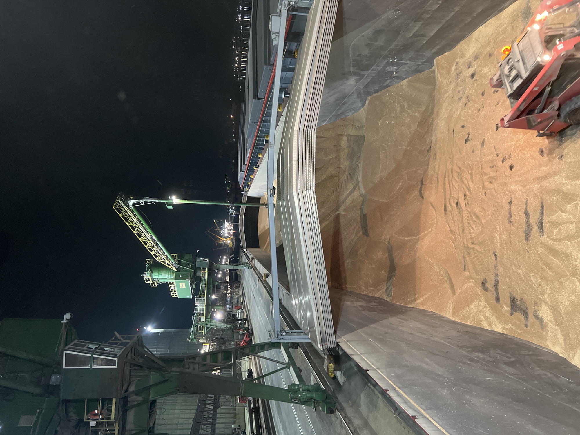 The image depicts a nighttime scene at the Port of Constanța, Romania, showing a bulk cargo vessel undergoing loading or unloading operations. The foreground displays a large, open cargo hold of a ship, filled with a substantial quantity of light brown, granular material, consistent with grain. On the right side of the open hold, several metal hatch covers are stacked horizontally. On the dockside to the left, a tall, green industrial crane structure is prominent, featuring a multi-windowed control cabin positioned at an elevated height. Inside this cabin, a person wearing a high-visibility orange vest is partially visible. Further along the dock, another large green gantry crane with a yellow boom, labeled "SUPER TOWER," extends over the vessel's cargo area. Industrial lighting illuminates the immediate operational zone, creating bright areas and deep shadows against the dark night sky. Within the cargo hold, near the bottom right, a red skid-steer loader with illuminated headlights is positioned on the granular material, indicating active management or leveling of the cargo inside the vessel. The dock area behind the fixed crane includes visible railway tracks, industrial buildings, and additional machinery. In the far background on the right, lights from other vessels or urban areas are reflected on a body of water, confirming a port setting.