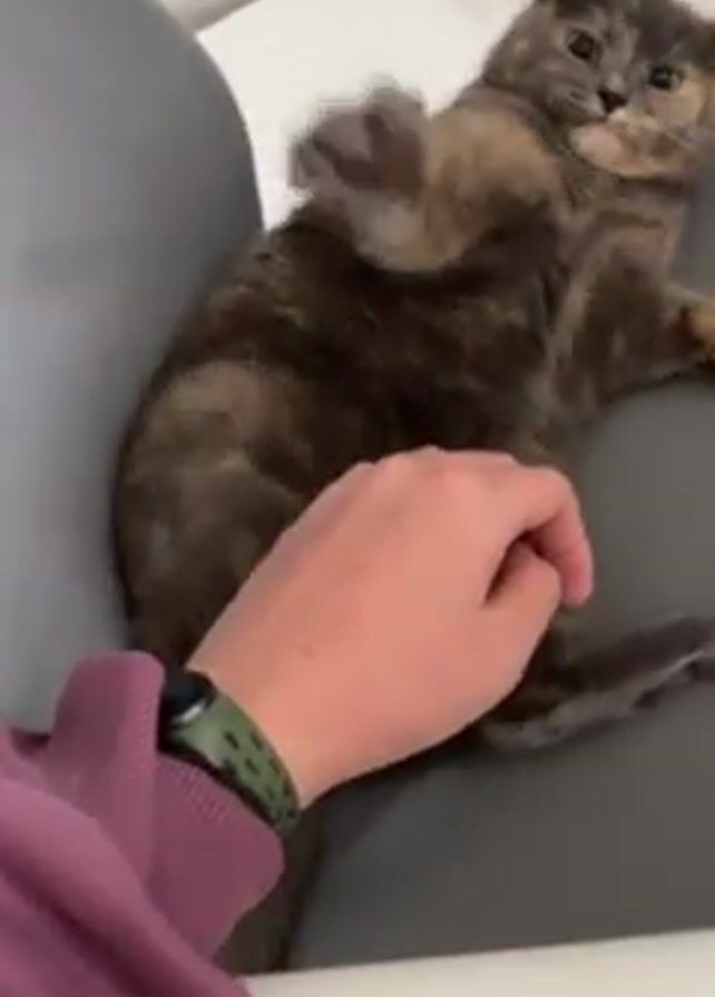 A person wearing a purple sweatshirt and a green fitness tracker is petting a calico cat that is sitting on a gray surface. The cat turns on its back, showing its belly. When the person pets the cat's head, the cat bites the person's hand and wrist.