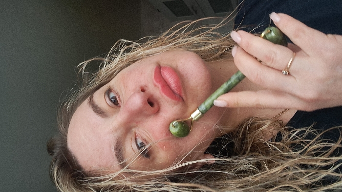 A female subject is depicted in a close-up, self-portrait-style photograph, taken indoors, presumed to be in Меткомелино, Russia. The woman, with blonde, wavy, shoulder-length hair, looks directly towards the camera. Her face shows some freckles and a visible reddish flush on her left cheek. She is actively using a green jade facial roller, positioning the smaller roller head against her left cheek. Her right hand, which holds the roller, has a gold-toned ring with a clear stone on the ring finger. Her nails are manicured with a light polish. The subject's lips are full and tinted pink. She wears a dark-colored garment, possibly a t-shirt, and a thin gold chain necklace is visible around her neck. The background is a dark, nondescript surface, possibly a wall, with a subtle lighter area on the right suggesting ambient light.