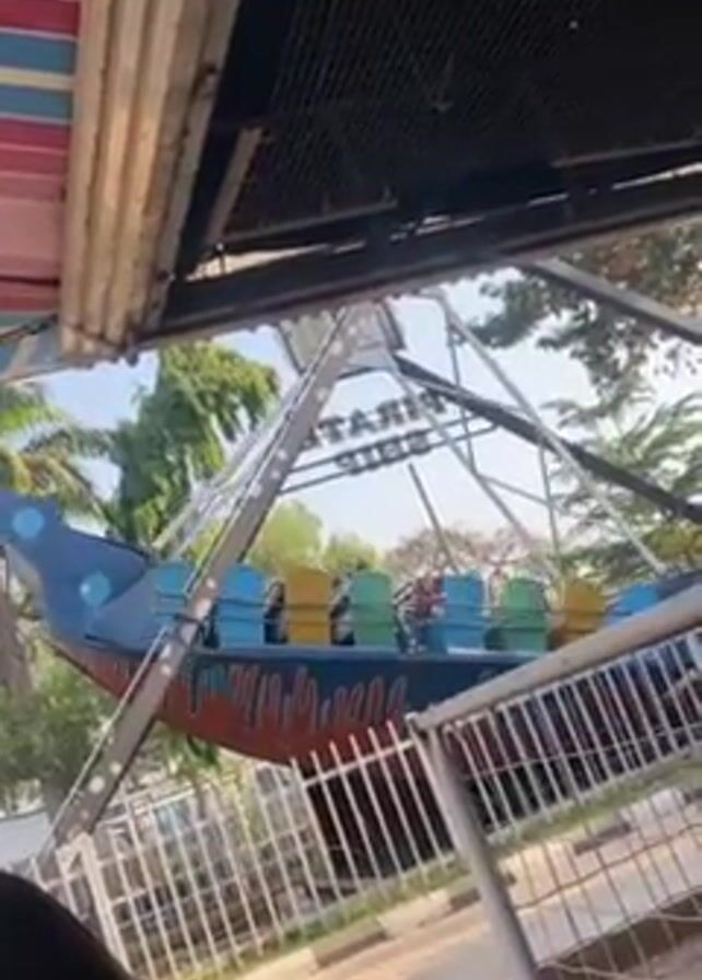low-angle view of a pirate ship-themed amusement park ride in motion. The ride, labeled "Pirate Ship," is blue and yellow, with flame-like decorations on its hull. The ride is partially filled with riders. The ride swings back and forth. The video is taken from under the roof of another ride and looking through a white metal fence. Lush green trees are in the background under a bright, sunny sky.