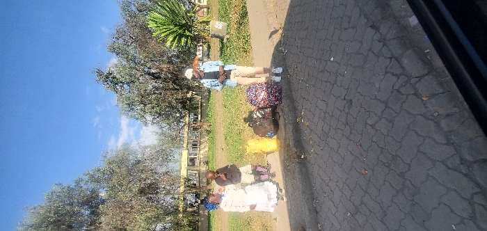 An outdoor daylight scene in Viwandani ward, Kenya, shows three individuals and four items of luggage on a dry, grassy verge