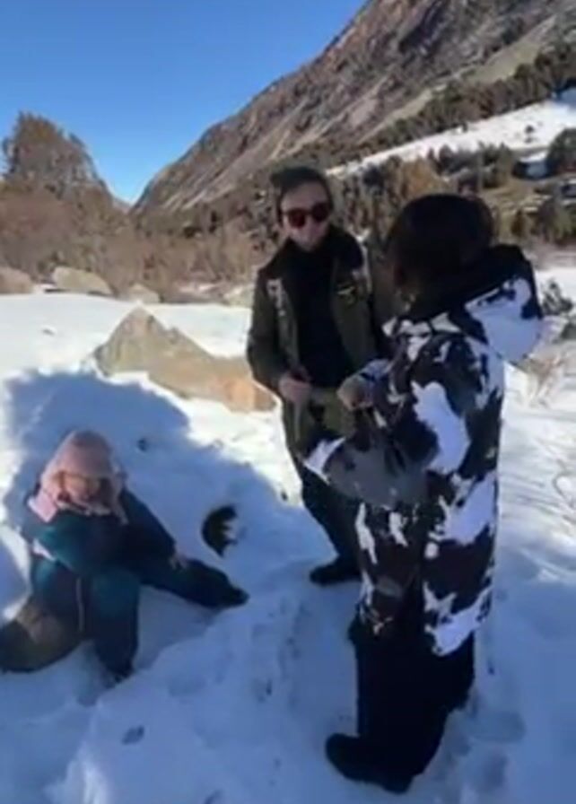 A sunny outdoor scene shows a family of three - two adults and a child - in a snowy mountainous area
