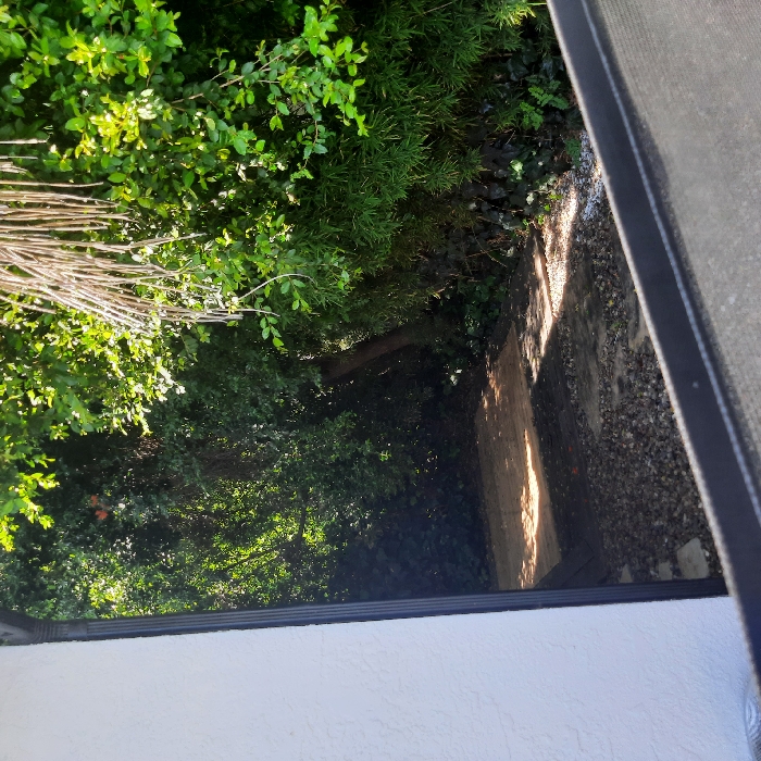 The image depicts an outdoor scene, likely a backyard or side yard, located in the city of Los Angeles, United States of America. The view is framed from an interior perspective by a dark, textured horizontal bar in the immediate foreground, consistent with a window screen frame. To the far left, a white, textured wall, characteristic of stucco, runs vertically, adjacent to a dark vertical element resembling a downspout or window trim. The ground area in the mid-ground is irregular and uneven. A rectangular patch of light brown material, consistent with wood or compacted earth, is prominently visible on the left side, brightly illuminated by direct sunlight. The remainder of the ground is covered by darker gravel or small stones, interspersed with a few square paving elements. Strong shadows are cast across these ground surfaces, indicating a high sun angle. The background is dominated by dense, lush green vegetation, composed of various trees and shrubs. A tree trunk is partially visible in the mid-left. The foliage includes a mix of broad-leafed plants and thinner, bamboo-like stalks, particularly on the right side. From the upper right, several dried, light brown fronds, consistent with those of a palm tree, hang downward into the frame. No individuals, animals, or specific objects suggesting human activity are present. No actions or interactions are depicted. The environment is outdoors, under clear, strong natural sunlight, suggesting daytime conditions.