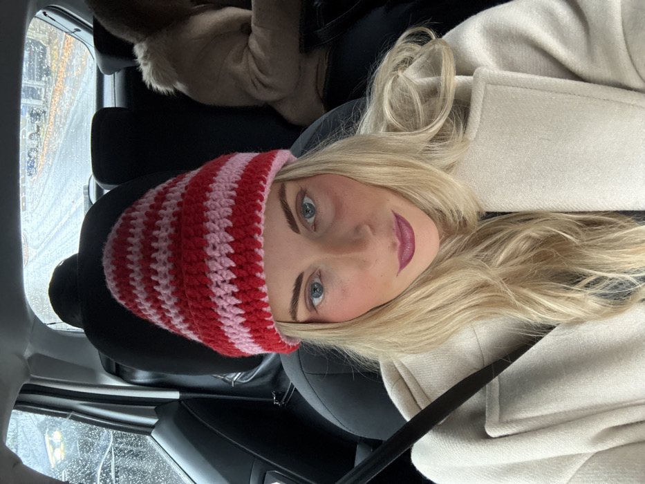 A female individual is positioned in the front passenger seat of a vehicle, looking directly forward. She has long blonde hair, blue eyes, distinctive red blush on her cheeks, and dark red lipstick. She is wearing a red and pink horizontally striped crocheted beanie and a light cream or beige collared coat over a dark garment. A dark seatbelt extends diagonally across her chest. In the rear passenger seat on the right, a second individual is partially visible, dressed in a brown or tan jacket with a fur-trimmed collar. The vehicle's interior is dark. Through the windows, a wet asphalt road surface is visible, suggesting precipitation. Distant vehicles and trees are discernible along the roadside under an overcast sky. The scene is located in the city of Nanterre, France.