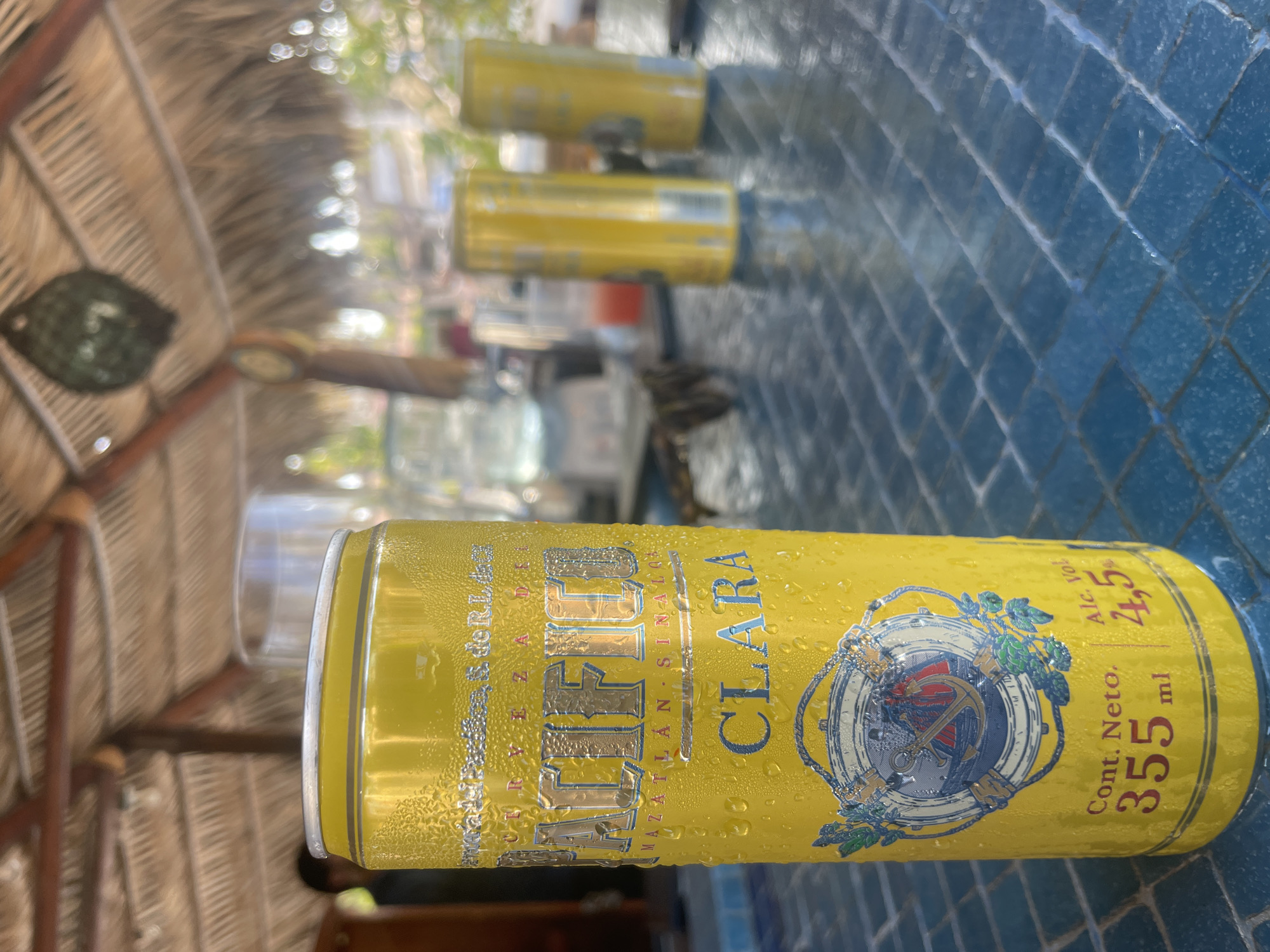 close-up of a can of Pacifico Clara beer, covered in condensation droplets, sitting on a blue tiled surface. Other blurred cans of the same beer are visible in the background. The image appears to be taken at an outdoor location, possibly a bar or restaurant, as indicated by the partial view of a thatched roof structure and other tables in the background. While the image indicates that it is a Pacifico Clara beer, it is insufficient to verify the exact location in Buenavista, Mexico, or any specific people or interactions.