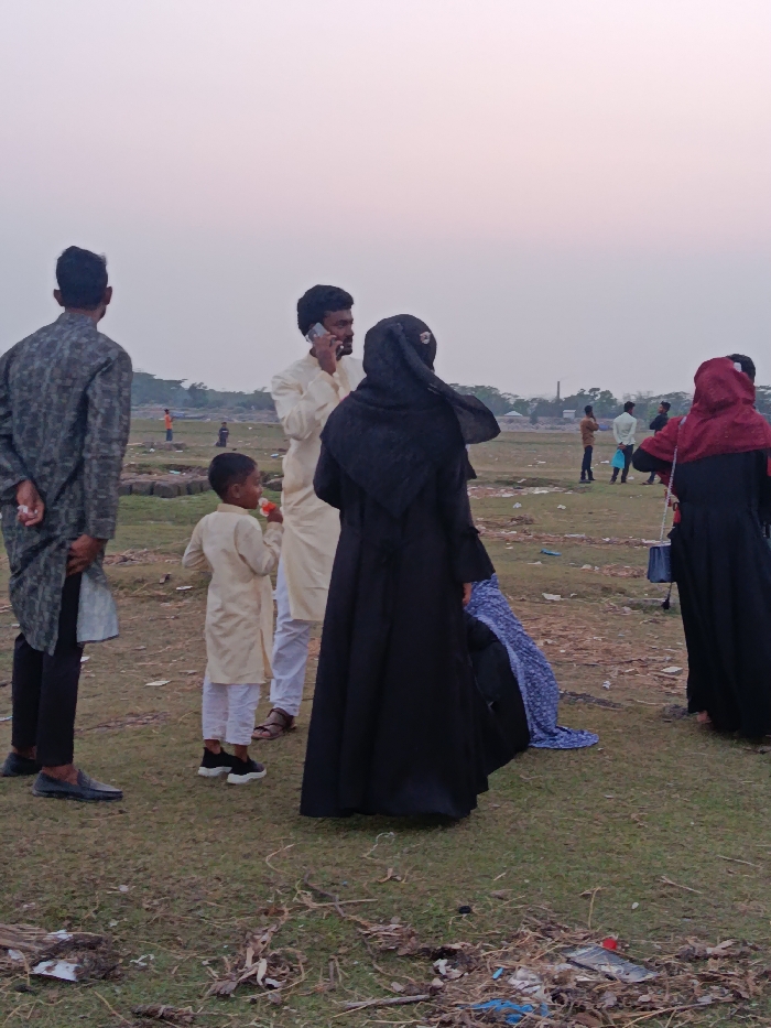 An open, grassy field in Charfasson Sadar, Bangladesh, is depicted under an overcast, pale grey sky with a subtle pinkish hue, suggesting dusk or dawn. In the immediate foreground, a group of five individuals, primarily adults and one child, stand on uneven ground with scattered debris, including dry vegetation and plastic waste. From left to right: A man with his back to the camera wears a patterned dark grey tunic (punjabi) and black trousers, with his left hand in his back pocket. To his right, a young boy in a cream-colored tunic and white trousers, with black and white sneakers, holds a small red and white object in his right hand while looking towards the center-right. Adjacent to the boy, a man with dark, curly hair and a beard, dressed in a cream-colored tunic and white trousers with sandals, stands facing left, holding a white smartphone to his right ear, engaged in a call. Behind this man and boy, a woman, her back mostly to the camera, wears a black abaya and a black hijab, her left arm slightly bent. A blue and white patterned garment lies partially visible on the ground near her feet. Further right and partially obscured, another woman, also with her back largely to the camera, wears a black abaya and a red/maroon hijab. She carries a small dark blue handbag on her left shoulder. In the mid-ground and background, the field extends towards a low horizon featuring distant structures, including a possible treeline or buildings, and a tall, slender industrial-like chimney or tower on the right. Several other indistinct figures are scattered across the distant field. The overall environment appears rural or semi-urban, characterized by open space and limited visible infrastructure in the immediate vicinity.