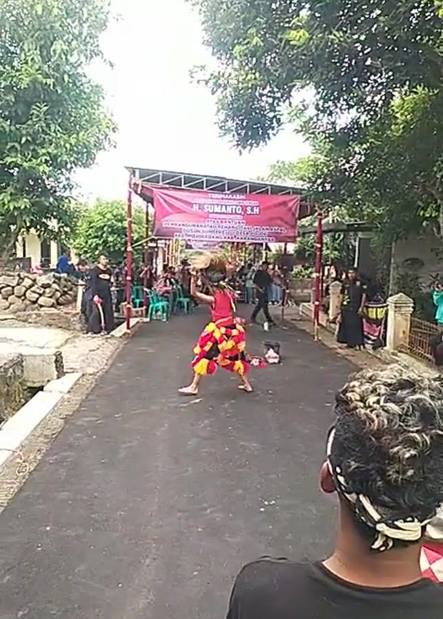traditional Indonesian dance performance. A young person in a bright red and yellow costume dances on a paved road, while musicians with instruments sit in front of a banner that reads "H. SUMANTO, S.H." People stand and watch on both sides of the road, surrounded by trees and buildings. The camera is held by a person wearing a black shirt with a logo that says "SENI JARAN PACAR."
