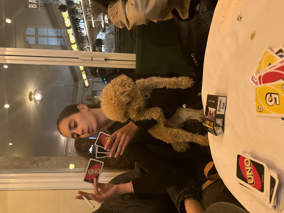 The image displays an indoor scene within a bar or cafe in an unknown city and country. A young adult female with dark hair, pulled back, is centrally positioned, seated at a light-colored round table. She wears a dark long-sleeved top and holds a fan of Uno cards in her left hand, looking down at them with a focused expression. On her right arm, she holds a small, light brown poodle-type dog with curly fur, which wears a dark collar. To the left, a partial view of another individual's hand shows a lit cigarette held between the fingers. On the white table surface, stacks of Uno cards are visible, along with a black cigarette pack featuring white text, including the French warning "Fumer tue" (Smoking kills). The background, seen through a large window or reflective surface, reveals a well-stocked bar counter with numerous bottles illuminated by a line of yellow lights, and a blurry figure presumed to be a staff member. Dark green upholstered booth seating is present behind the main subject. The scene is illuminated by warm, artificial lighting.