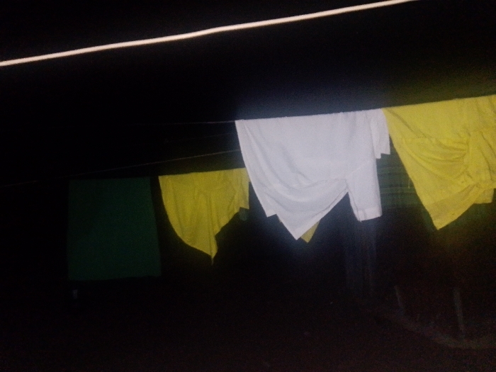 Hanging clothes on a clothesline at night. A white sheet and yellow cloth are draped close together, with a green cloth further to the left. A dim light source illuminates the scene from above. The darkness of the background obscures details. A thin line stretches across the top of the image, appearing brighter due to the lighting.