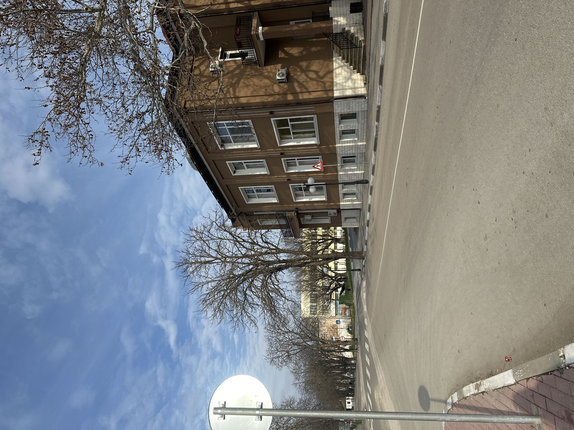 The image displays a street scene in Pordim, Bulgaria, under a partially cloudy blue sky during daylight. The foreground on the left shows a silver metal pole with a circular white sign attached, positioned on a red brick pavement separated from the asphalt road by a concrete curb. A small red object is visible on the asphalt near the curb. The asphalt road, featuring a solid white lane line on its right side, curves gently leftwards into the background, where a pedestrian crosswalk and a "No Entry" sign are discernible. On the right, a prominent two-story building with a brown stucco facade occupies a significant portion of the frame. Its lower section is constructed with white stone-like blocks. The building features multiple white-framed windows, several external air conditioning units, and a small balcony with black railings on its upper right side. Stone steps with black railings lead to an entrance on the right side of the building. A black lamppost with two globe lights stands in front of the building, adjacent to a red triangular pedestrian crossing sign. Shadows from bare trees are cast upon the building's facade. A line of bare deciduous trees runs along the left side of the road, extending into the background, where another multi-story building with yellow and white sections is partially visible. No individuals or moving vehicles are present in the scene.
