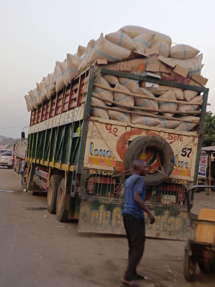 A heavily overloaded truck with sacks stacked precariously high on its bed