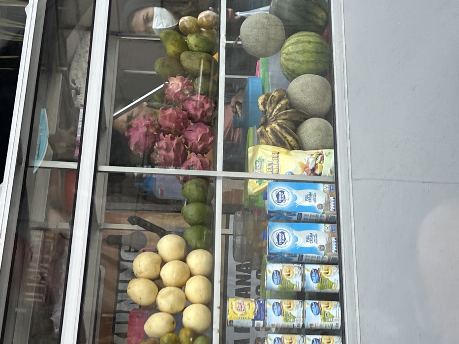A glass display case showcases various fruits, including dragon fruit, green fruits stacked on top of each other, and yellow pears. Melons, watermelons, and bananas are also visible, along with several boxes of "Fill Cream" milk and cans of an unidentified product. A person wearing a face mask is reflected in the glass.