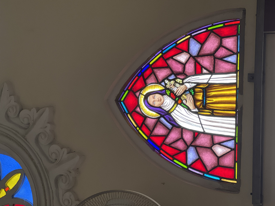 The scene is an interior view of a religious edifice, specifically a Catholic church, likely the Notre-Dame Cathedral Basilica of Saigon in Ho Chi Minh City, Vietnam. A prominent gothic-arched stained glass window is centrally positioned, depicting a full-figure portrayal of Saint Thérèse of Lisieux. The saint is clad in a white Carmelite habit, a brown scapular, and a purple veil, with a golden halo encircling her head. She holds a small crucifix in her left hand and a cluster of red and green roses against her chest. The window's surrounding paneling consists of a geometric mosaic of colored glass pieces in shades of red, pink, blue, green, and yellow. Above and to the left of the arch, a section of an ornate white stucco molding with scrolled patterns is visible on a light-toned wall. Further to the left and partially obscured by the stucco, a portion of a circular stained glass window with blue, yellow, and red segments is visible, alongside a white, caged electric fan mounted on the wall or ceiling. A dark, linear structural component is present at the base of the main stained glass window.