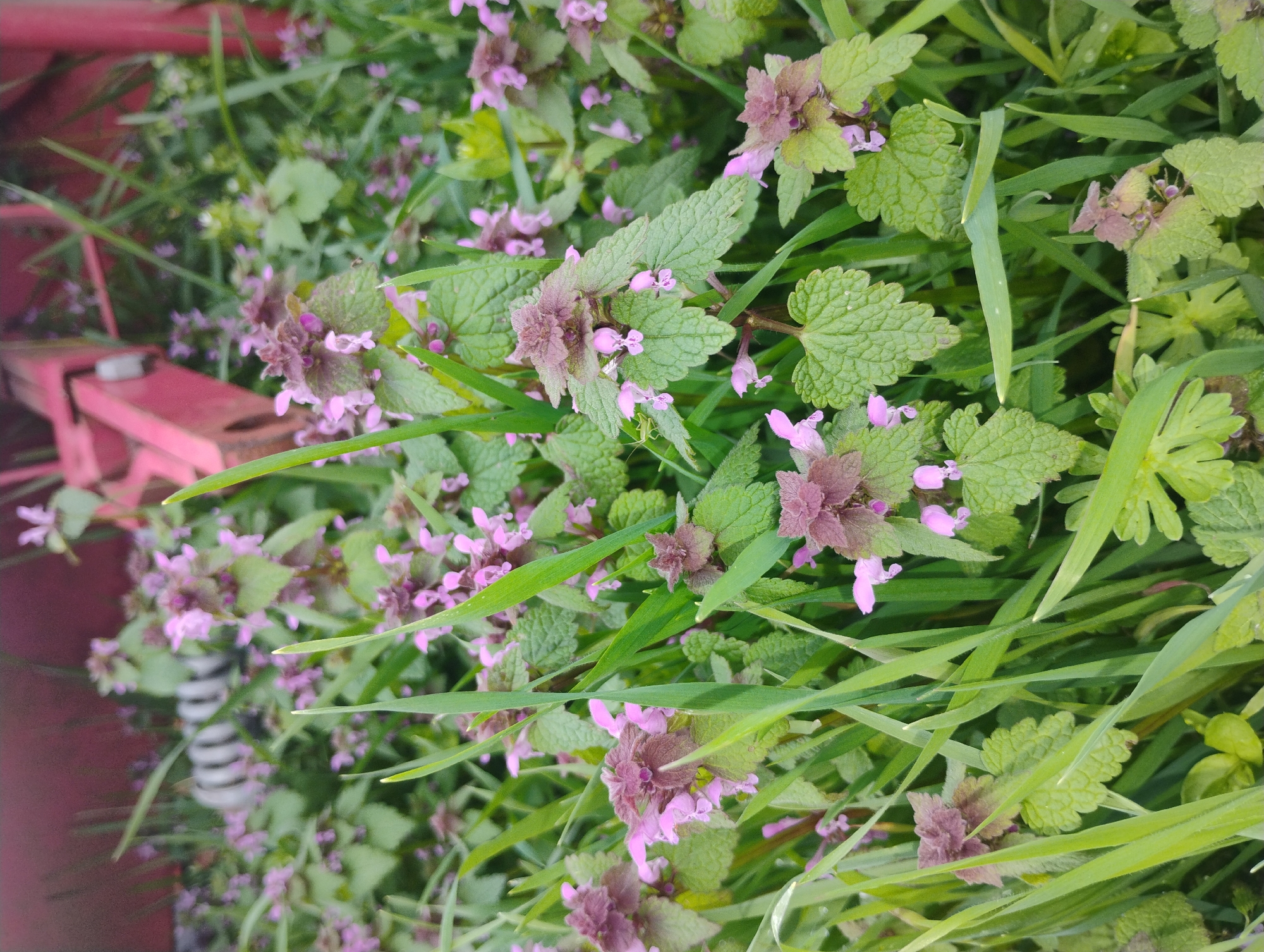 A close-up, ground-level view shows a dense patch of greenery, predominantly purple dead-nettle (Lamium purpureum) with its distinctive pinkish-purple flowers and green leaves
