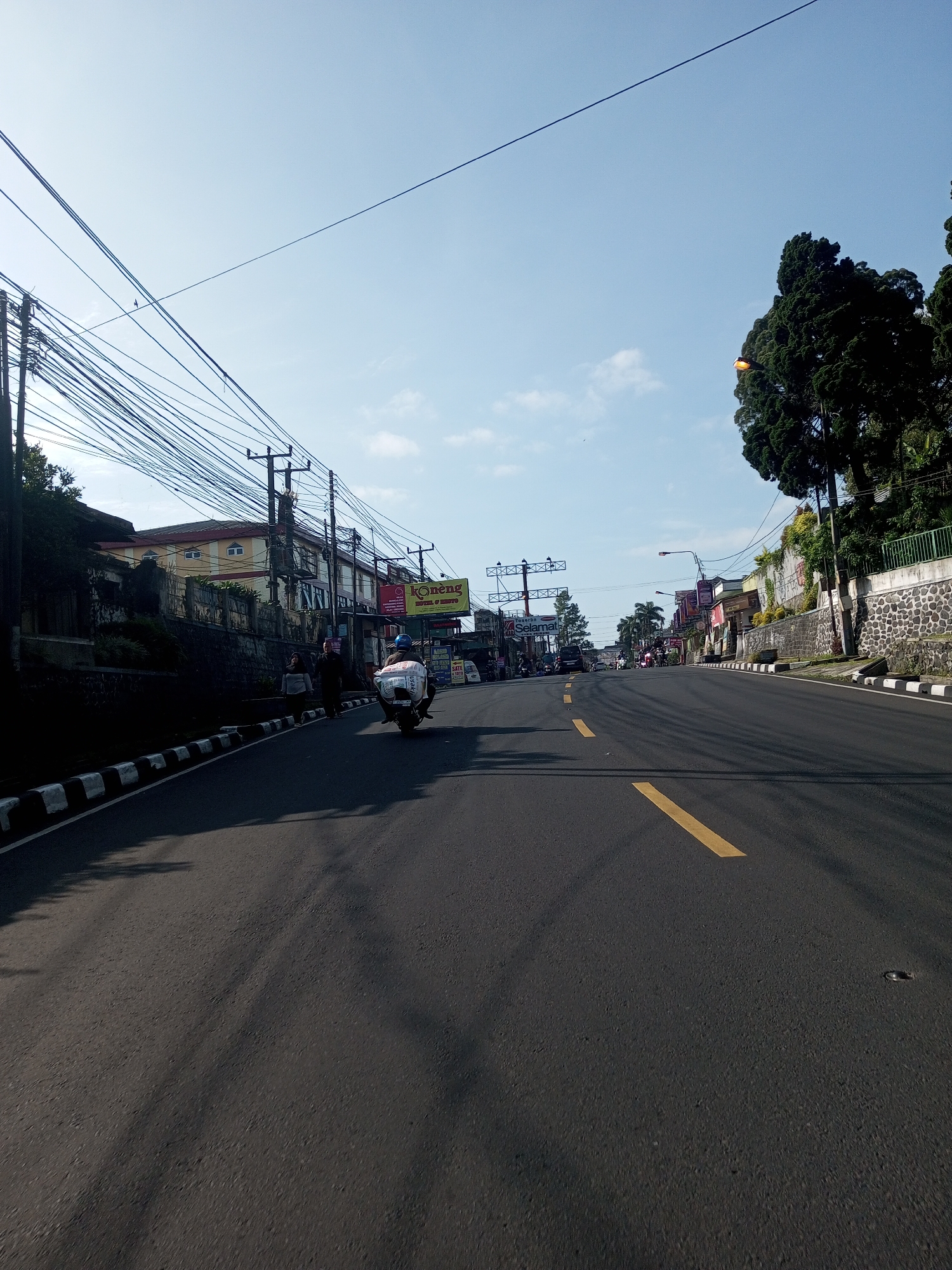 The image depicts an asphalt road in Nhot Chang, Laos, under a clear sky with a few clouds. The road is marked with a broken yellow line down the center. Power lines run across the top of the frame, appearing dense on the left and thinning toward the right. Buildings line the left side of the road, interspersed with trees and vegetation. A concrete wall topped with vegetation borders the road on the right. A person is riding a motorcycle down the road. The photo is taken from a low perspective, suggesting the viewpoint of someone on or near the road surface.