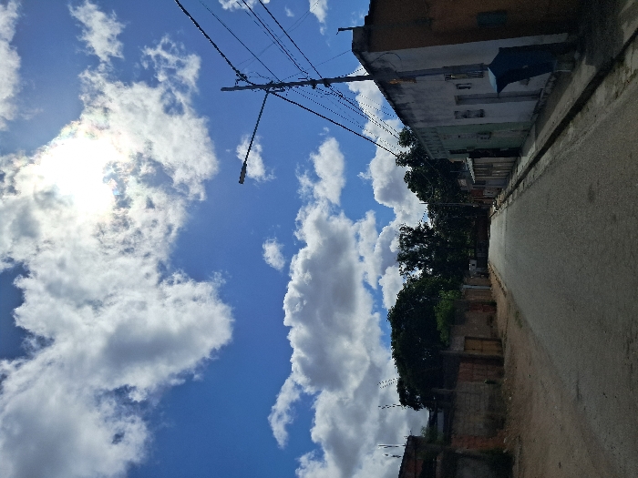 This image depicts a street scene in the city of La Guardia, Venezuela, on a bright, partly cloudy day. The view is looking down a paved, unoccluded road that recedes into the distance. The sky is a clear blue, interspersed with numerous white cumulus clouds, and the sun is prominently visible in the upper right quadrant, partially obscured by clouds, casting a strong glare. On the left side of the road, a dirt shoulder precedes a series of low, unpainted concrete block walls, some topped with exposed rebar. Beyond these walls, dense green foliage and trees are visible, obscuring any structures behind them. The right side of the road features a narrow concrete sidewalk bordering a row of single-story buildings. These structures display varied facades, some appearing weathered with peeling paint (e.g., light green, faded orange-brown), and feature small windows or doors. A dark utility pole with an attached streetlamp extends into the frame from the right, supporting multiple overhead power lines that run diagonally across the upper right portion of the image. A dark blue utility box is mounted on the exterior wall of one of the buildings on the right. The road appears devoid of pedestrian or vehicular traffic.