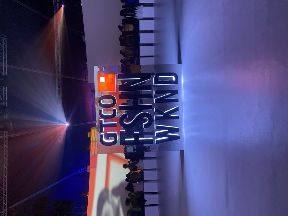 The scene is an indoor event venue in Itirin, Nigeria, characterized by stage lighting and a dark environment. A large, illuminated sign in the foreground prominently displays "GTCO FSHN WKND" in stacked, dark block letters with bright white internal lighting. The base of the sign emits a blue glow, reflecting on the light-colored, reflective floor. Overhead, a metal truss structure supports multiple stage lights, with two distinct beams—one red-orange and one blue-white—converging in the upper center. Along the left background, approximately 10-15 individuals are seated on elevated white benches, facing the central area. A similar group of 10-15 individuals occupies the right background seating. The individuals are largely silhouetted, with no discernible active interactions. A large white screen with a faint, abstract projection is visible behind the seated group on the left. The dominant light source is from the stage fixtures, creating a blue and purple ambient glow on the floor.