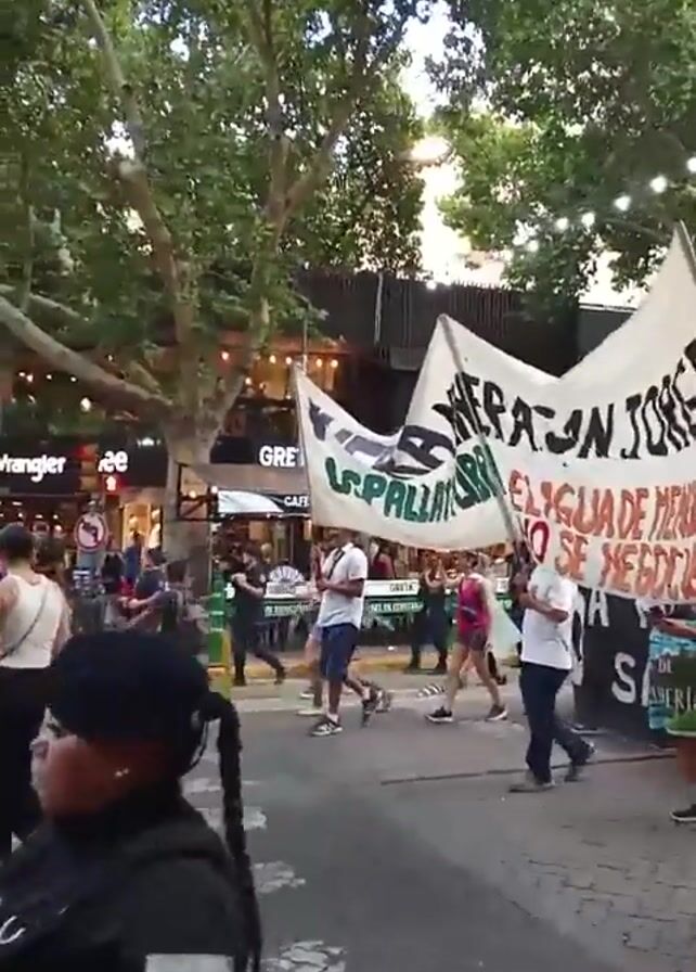 protest taking place in a city environment. People are walking across a crosswalk, carrying large white banners with writing on them. A person in a police uniform is visible in the foreground, facing the protesters. Trees line the street, and buildings with storefronts, including a Wrangler store, are visible in the background. The overall lighting suggests it is daytime.