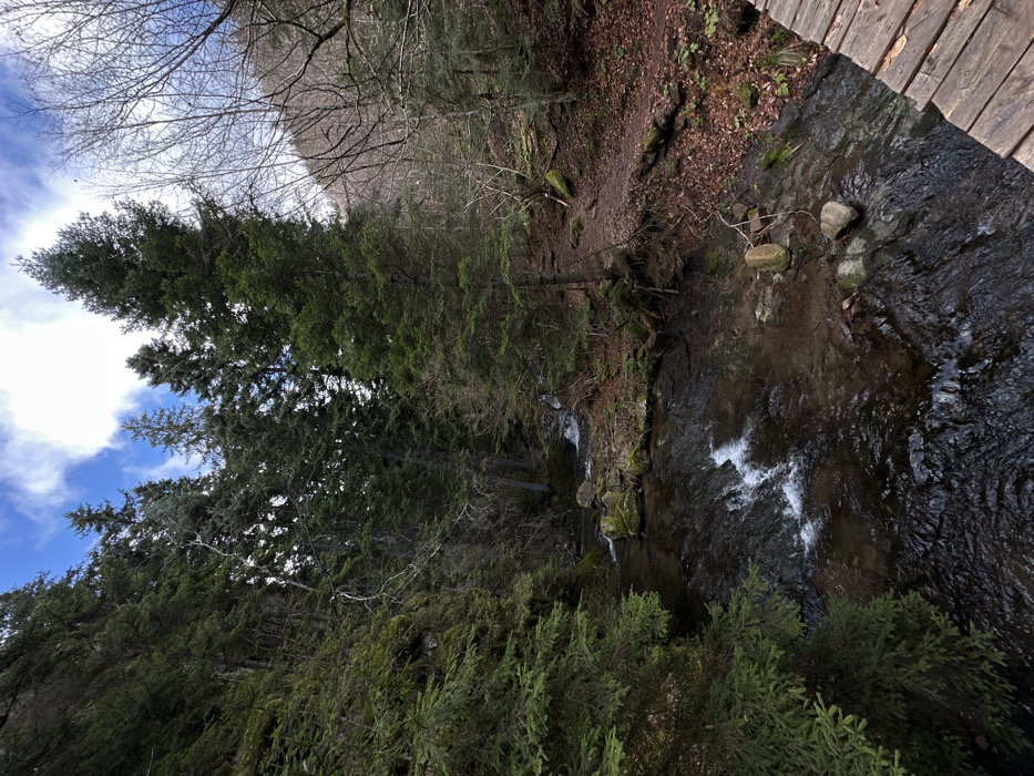 The image depicts a natural outdoor environment in Smolyan, Bulgaria, centered on a flowing stream flanked by dense forest under a partially cloudy sky. The stream occupies the lower and central portions of the frame, exhibiting dark water with visible rapids and white foam where it flows over submerged rocks. The left bank is characterized by a steep slope densely covered with tall, dark green evergreen trees. The right bank features a mix of evergreen and bare deciduous trees, with the ground covered in brown fallen leaves and visible sections of exposed earth forming a narrow dirt path or trail that recedes into the background. A wooden structure, consistent with a bridge or platform constructed from horizontal planks, is partially visible in the lower right corner. The sky, visible through the tree canopy, shows patches of blue sky interspersed with white clouds. No individuals or animals are present.