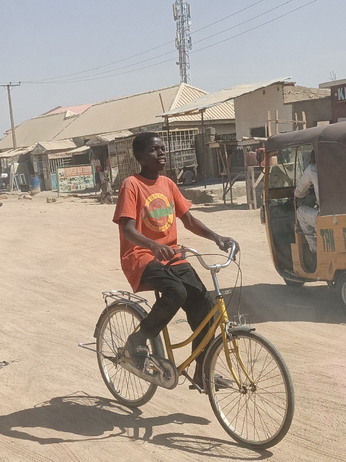 - "A young male rides a yellow bicycle on an unpaved, dusty road in Hotoro South, Nigeria, under a clear sky" by FM-Bh3W72, licensed under CC BY 4.0