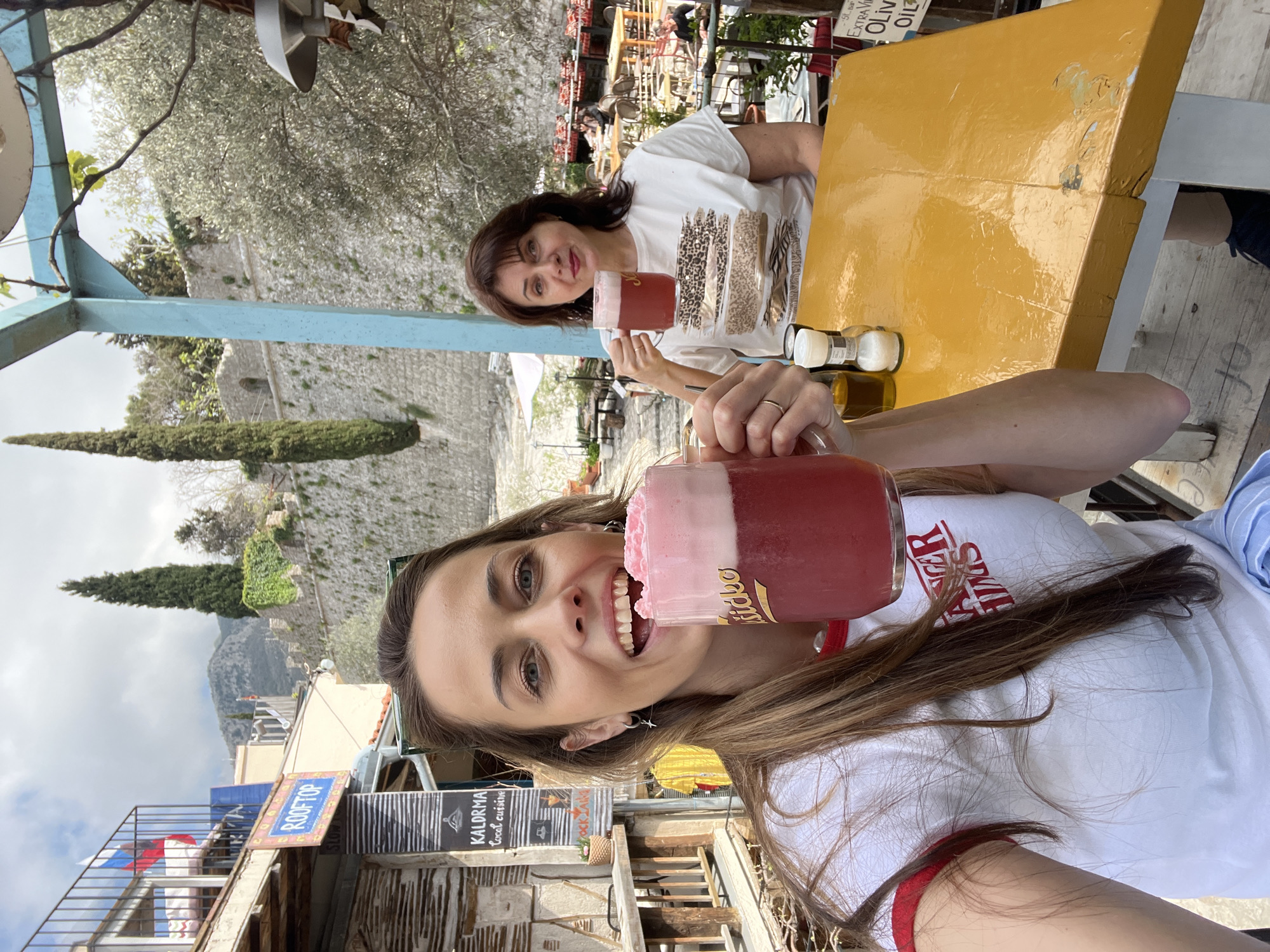 Two women are at an outdoor cafe in Stari Bar, Montenegro. The foreground woman holds a large glass of a pink liquid with foam on top. She is fair-skinned with long brown hair, wearing a white t-shirt with red accents. She is smiling. The background woman, also fair-skinned, holds a similar glass. She is seated at a yellow table with what appears to be salt and pepper shakers and a bottle of oil. The background includes stone architecture, cypress trees, and a mountainous landscape. Signs indicating the location, including "ROOFTOP" and "KALDRMA coral cuisine" are visible. The Russian flag is partially visible. The light suggests it is daytime.