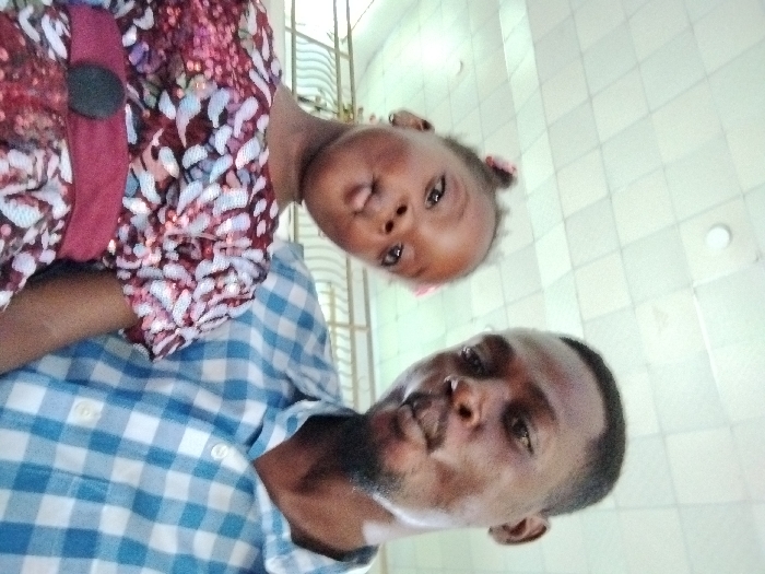 An indoor, close-up, low-angle photograph taken in the city of Kabong, Nigeria, features two individuals. On the right, an adult male with a dark complexion, short dark hair, and facial stubble wears a blue and white checkered button-up shirt. His lips are pursed. On the left, a young female child with a dark complexion and dark hair tied back, with a pink hair accessory visible, wears a patterned dress featuring red, white, and dark colors, accessorized with a dark red waist sash and a circular dark embellishment. Her lips are also pursed. Both individuals are looking directly at the camera. The background displays a white suspended ceiling with a grid pattern and a circular light fixture in the upper left. A light-colored, patterned structure is visible behind the male's right shoulder.