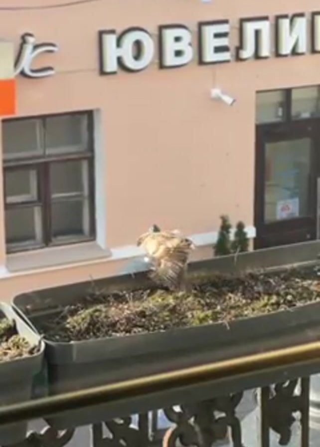 sparrow sitting in a plant box outside a building. The building is peach-colored with white lettering that says "ЮВЕЛИР" in Russian, which translates to "Jeweler". The plant box is black and has dead-looking plants in it. The camera is positioned on a balcony with a black railing in the foreground. The sky is not visible.