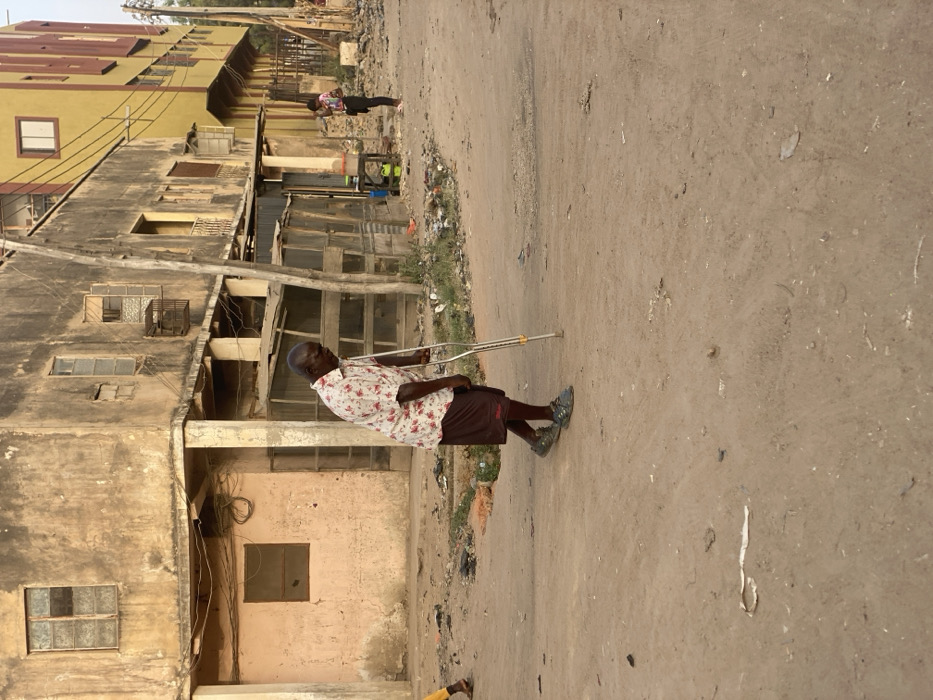 An elderly man with a crutch stands on a dirt road. He wears a short-sleeved button-down shirt with a floral pattern and dark shorts. He wears gray shoes. Buildings, one yellow and one tan, stand to the left. Debris lies on the side of the road between the man and the buildings. A person in dark clothing walks farther up the road.