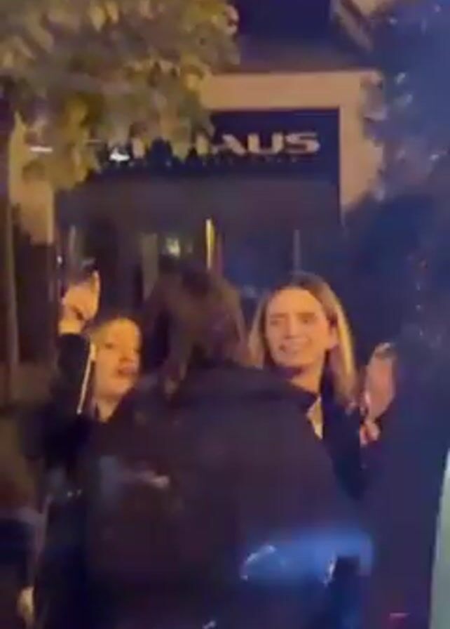 A group of about six women are on the street at night, in front of a building with a sign that reads "THAUS." They are smiling and waving, appearing to be posing for a video or photo. Some of them are holding drinks or cigarettes. There are trees on the side of the building, and the street is lit.