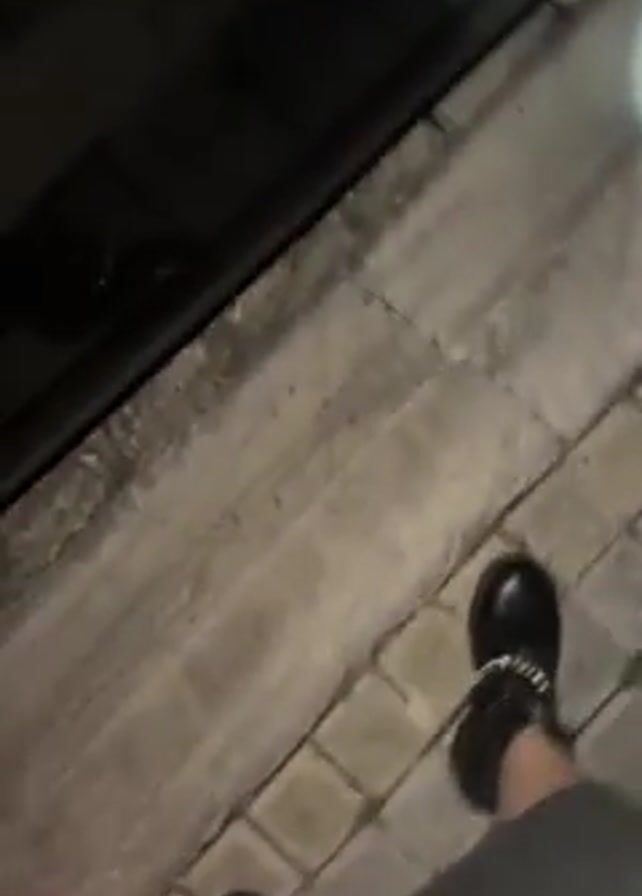 person wearing black boots with chain details stepping into a dark car. The scene is dimly lit, suggesting it is nighttime. The person opens the car door and places their feet inside the vehicle. The car's interior is mostly black.