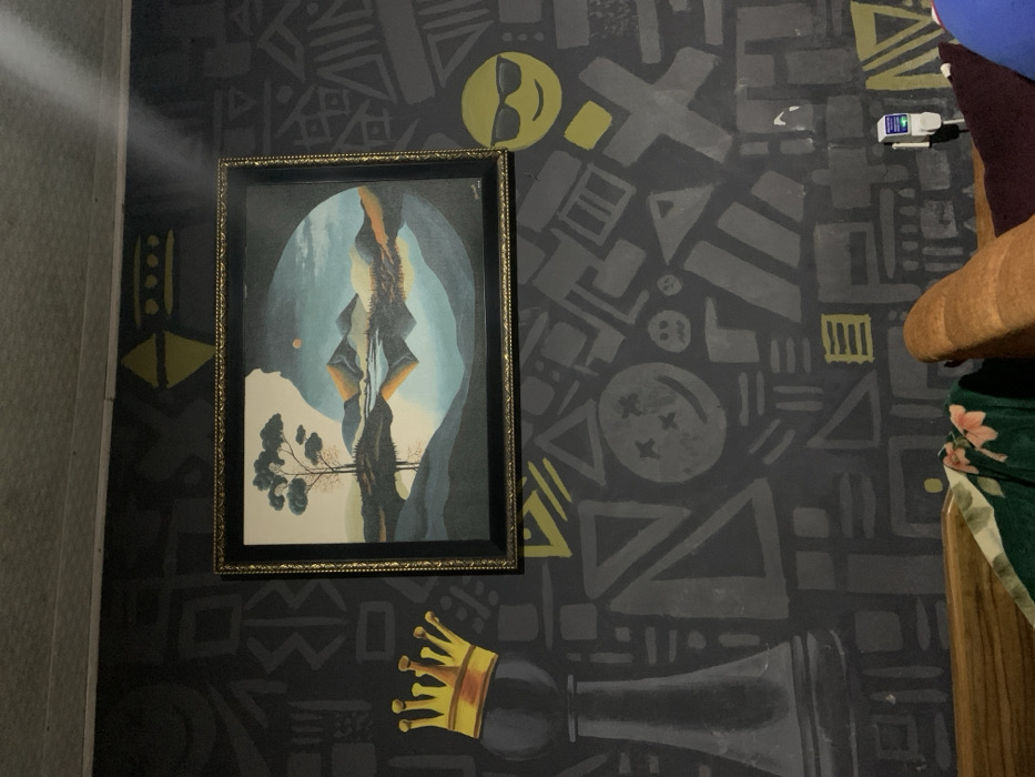 A framed painting of a surreal landscape hangs on a dark wall covered with stylized geometric and abstract drawings in gray and yellow. The painting depicts mountains and trees in muted colors. A chess piece, a king, is drawn in the lower part of the wall, underneath the painting. To the right, a chair is partially visible with colorful fabric draped over its side. A white charging block and cable are visible on the wall.