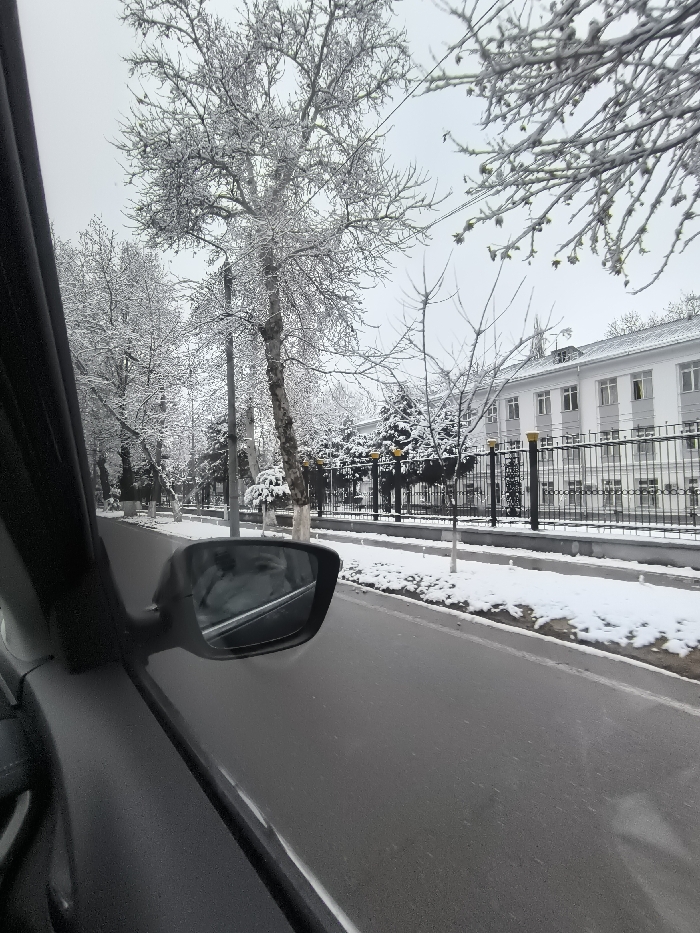 A winter street scene viewed from inside a car. Snow covers trees and lines the road. A building with a black fence stands to the right. The car's side mirror is visible, reflecting a partial image of the interior. The road surface appears wet, suggesting recent melting of snow. The sky is overcast, creating a muted light across the scene. The overall impression is cold and quiet.