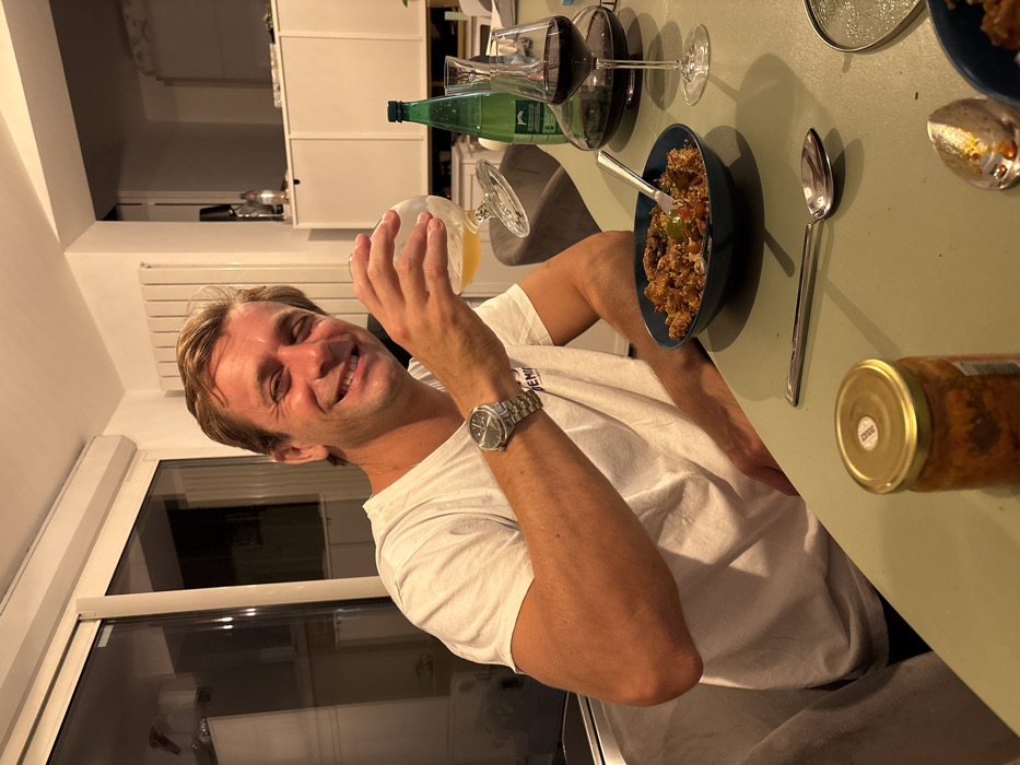 This image depicts an indoor dining scene within a residence in Cachan, France. The central subject is an adult male, approximately 30-40 years old, with fair skin and short, light brown hair. He is smiling directly at the camera and wears a white short-sleeved t-shirt. On his left wrist is a metallic watch with a link bracelet. He holds a clear, spherical glass containing a pale yellow liquid in his right hand, tilted as if mid-sip. His left forearm rests on a light green tabletop. On the table in front of him is a dark blue bowl containing a meal of rice, protein (possibly chicken or pork), vegetables including green bell pepper, and a reddish sauce, with a fork inserted into the food. To the right of the bowl are a clear wine glass filled with red wine and a glass decanter also containing red wine. Behind these items, a green glass bottle of Perrier sparkling water is visible. In the lower left foreground, a small glass jar with a gold lid, containing an orange/red condiment, rests on the table. A silver spoon lies on the table to the right of the jar. A portion of another dark blue bowl and spoon is visible in the bottom right corner. The background reveals a modern domestic setting. To the left, a large white-framed sliding glass door or window reflects interior light. A white vertical radiator is affixed to the wall in the mid-background. To the right, a white cabinet unit with multiple doors is visible, topped with various items, including a lamp with a black shade. The room is illuminated by warm artificial lighting.