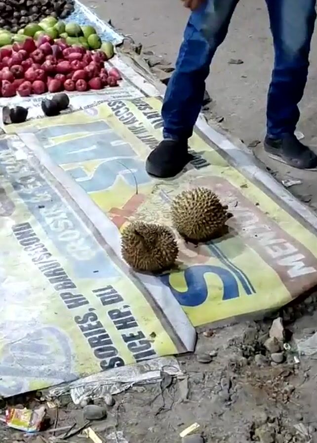 A man is shown selecting and placing a durian fruit into a large wicker basket on the side of a road