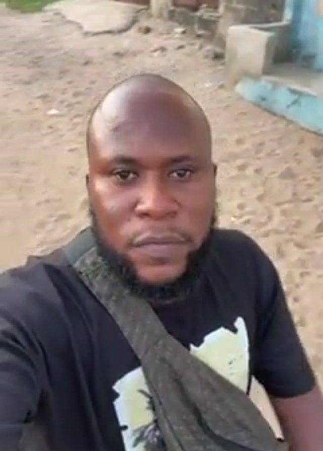 A man with a bald head, a beard, and a black t-shirt with a colorful graphic is recording a video in an outdoor area. He has a gray patterned bag slung across his chest. He is standing on a dirt or sand surface, possibly a road or a yard. Behind him are buildings of various colors, including yellow, blue, and gray. There is some graffiti or painted art on one of the buildings. The man is looking directly at the camera as he records.