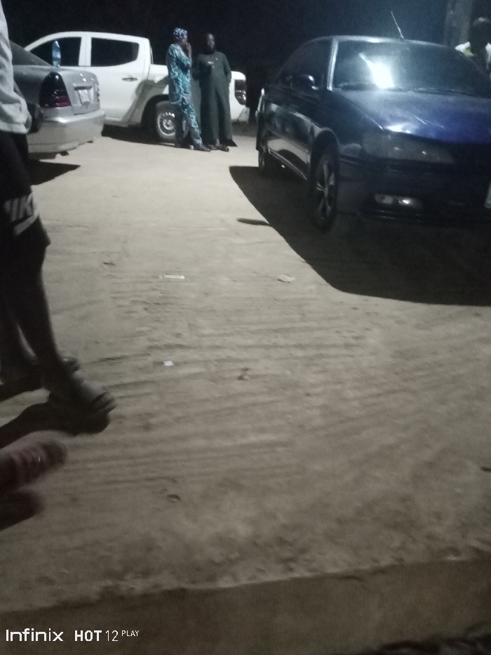 A nighttime scene reveals multiple cars parked in an open area. A dark-colored sedan sits prominently on the right, casting a long shadow. Further back, a white truck and a silver car are visible. Three people stand near the white truck, two dressed in traditional attire. A person's lower body is in the foreground, wearing shorts and sandals. The ground appears to be a sandy surface, and the "Infinix HOT 12 PLAY" watermark is at the bottom left.