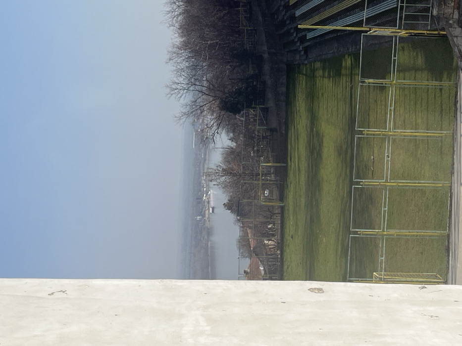 The image displays an elevated panoramic view of Tutrakan, Bulgaria, looking northeast over a section of the city and the Danube River. The left vertical third of the frame is occupied by a textured, light-colored wall exhibiting minor surface imperfections. Below, a vibrant green sports field, identified as a soccer pitch, occupies the mid-foreground, featuring a yellow metal goalpost at its far end. A yellow metal mesh fence delineates the lower perimeter of this field. To the right of the field, tiered concrete spectator stands with yellow and dark-colored striped seating are visible. Beyond the field, a cluster of bare deciduous trees and some evergreen foliage partially obscure residential buildings with reddish-brown tiled roofs. The wide Danube River dominates the mid-background, its calm surface reflecting the sky. A flat-bottomed cargo vessel is situated on the river. The distant horizon reveals industrial structures and a low-lying, wooded landscape under a clear, hazy blue sky. No individuals, explicit actions, or interactions are discernible within the scene.