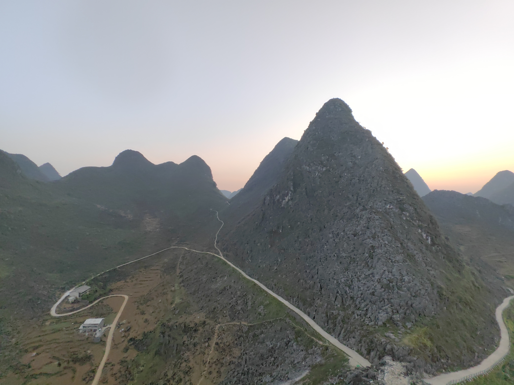 n aerial view of a mountainous landscape at sunset in Đồng Văn Commune, Vietnam