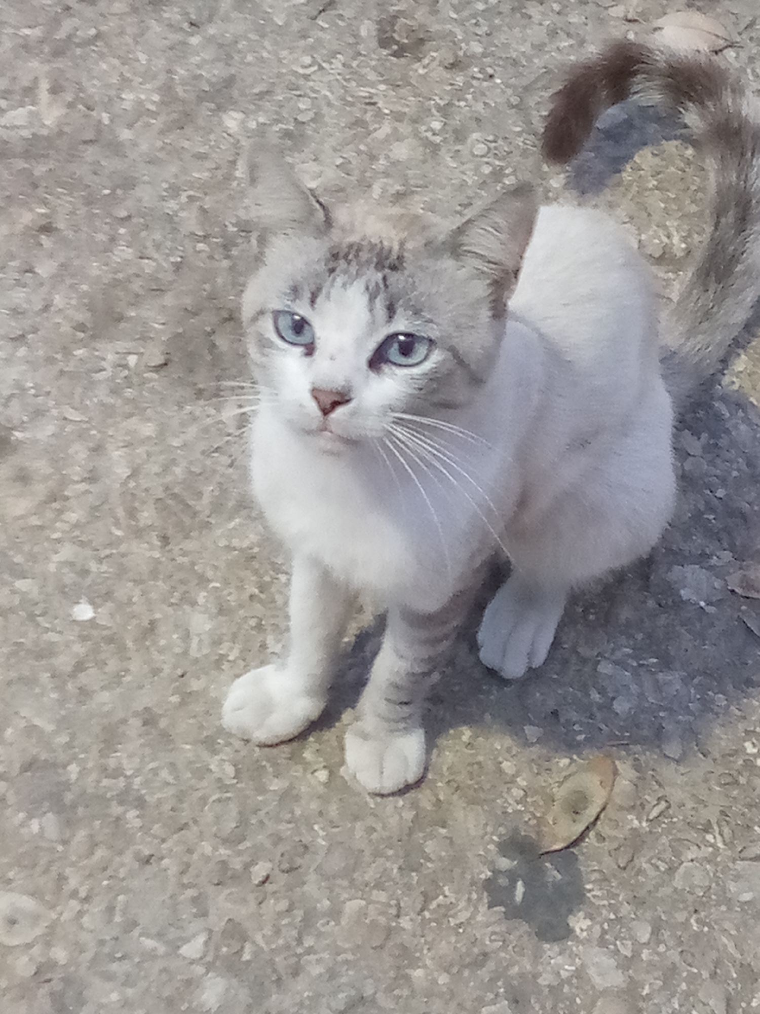 - "light gray cat with blue eyes sitting on a concrete surface" by FM-Q5qB73, licensed under CC BY 4.0
