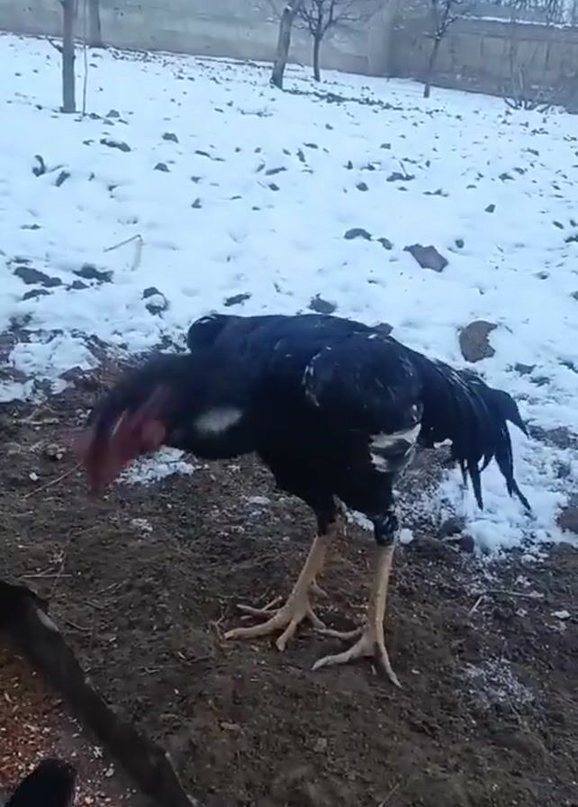 - "A black rooster with white patches stands in a muddy area with snow patches nearby" by FM-ie9cp2, licensed under CC BY 4.0