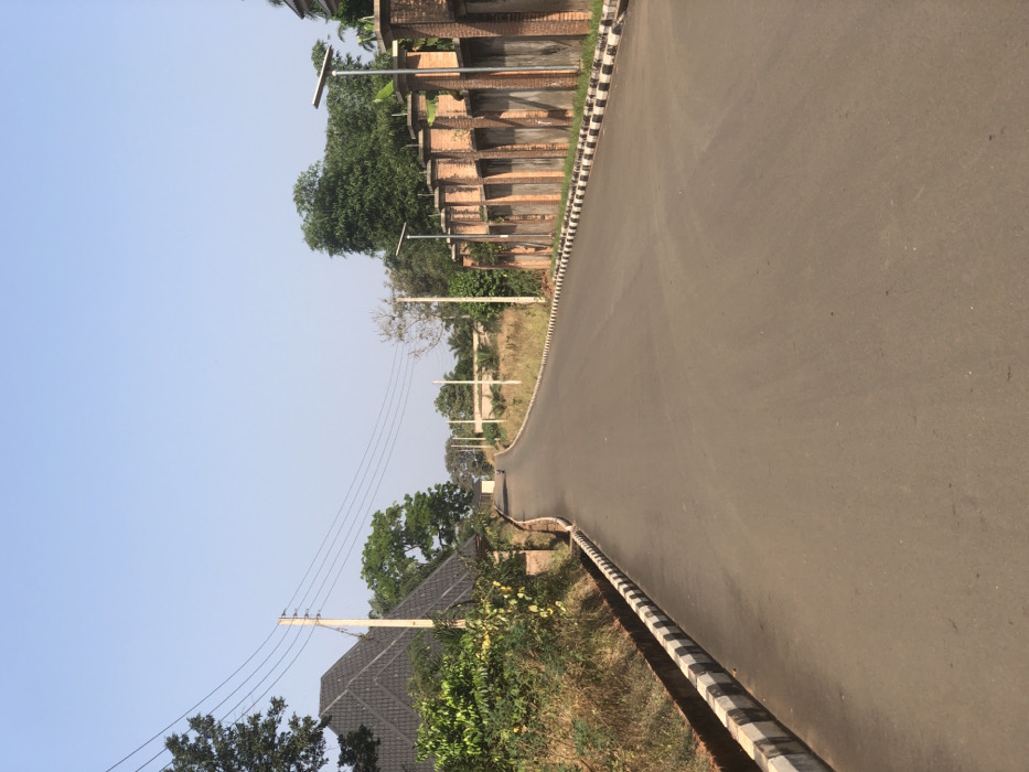 The image displays an empty paved road in Nsukka, Nigeria, under a clear blue sky