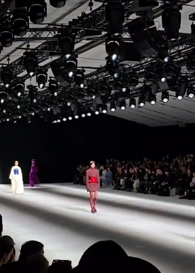 fashion show runway. Three models are walking down the runway, illuminated by bright spotlights. A large audience is seated on either side, most dressed in dark colors, watching the show. Overhead, a complex grid of lighting fixtures and rigging fills the ceiling. The models wear different outfits in muted tones: one in white, another in purple, and a third in a red and brown combination. The camera is static, capturing the scene from the perspective of someone in the audience. The atmosphere is formal and professional.