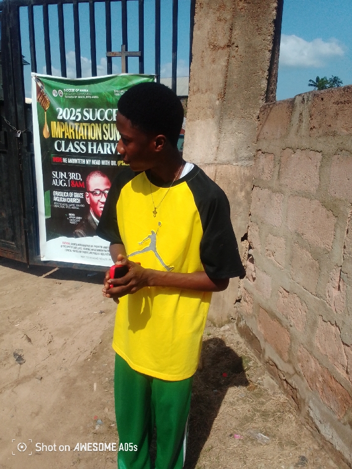 The image depicts a male individual standing outdoors in Ifite-Awka, Awka, Nigeria, specifically identifiable by a banner as being near the Basilica of Grace Anglican Church