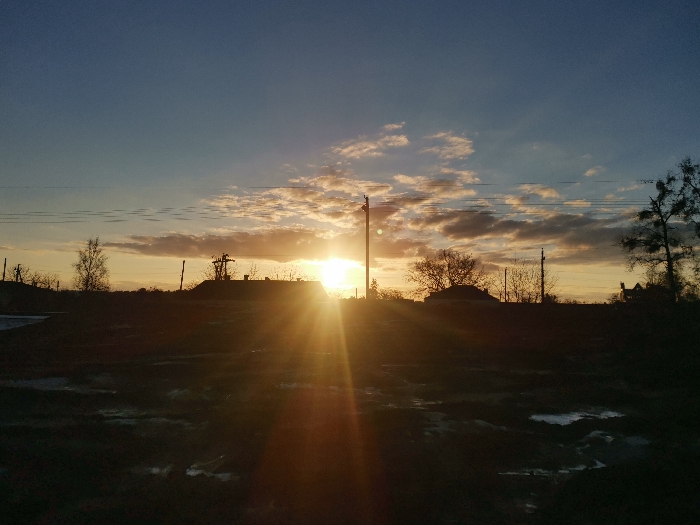 The image displays an outdoor scene at either sunrise or sunset in the city of Лосева, Belarus. The sky occupies the upper two-thirds of the frame, transitioning from deep blue at the top to an orange-yellow gradient near the horizon, populated by scattered cumulus clouds. The sun, positioned low on the horizon slightly left of center, emits strong light rays and a prominent lens flare extending into the foreground. Silhouetted against the bright horizon are multiple low-rise structures resembling houses, accompanied by numerous leafless deciduous trees. A distinct utility pole stands to the right of the sun, with another further right, supporting multiple horizontal power or telephone lines spanning the midground. An additional industrial-type structure, possibly a pylon, is visible further right in silhouette. The foreground consists of dark, uneven terrain, indicative of unpaved earth or mud, featuring several puddles of standing water that reflect ambient light. No individuals are visible within the frame. The strong backlighting renders all foreground and midground elements in deep silhouette.