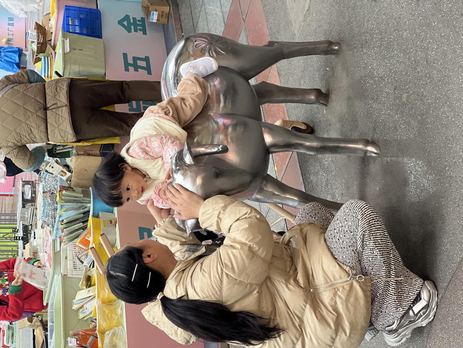 The image depicts a scene in a marketplace within Shapingba District, China. In the immediate foreground, a woman with long dark hair, secured in a ponytail with two white hairpins, is crouched on a speckled gray ground. She wears a beige puffer jacket, black and white patterned trousers, and silver athletic shoes. Her hands are positioned on the head and back of a shiny silver metallic statue of a stylized sheep or goat. A young child, a toddler with short dark hair, is lying prone on the back of this metallic statue. The child is dressed in a light pink long-sleeved shirt with a white patterned vest, light brown pants, and white shoes with blue accents. The child's head is turned towards the crouching woman. In the mid-ground, a market stall with a pink counter is visible, featuring blue Chinese characters that translate to "Hardware" or "Metals" ("五金"). Behind this counter, various items are displayed in bins and boxes. An individual wearing a brown quilted jacket and dark pants is partially visible tending to the stall. Other indistinct figures and additional market stalls are present in the background. The environment suggests an active commercial area, possibly an indoor or semi-outdoor market.