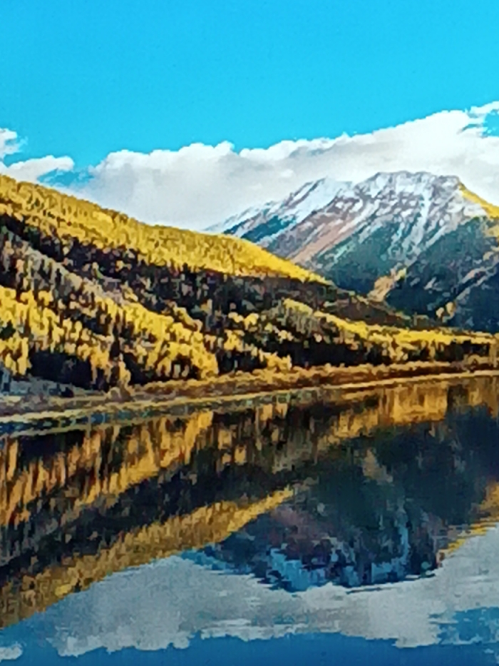 The landscape showcases a placid lake reflecting mountains under a bright blue sky with scattered clouds. A range slopes down to the water's edge, covered in dense, yellow-leaved trees. A snow-capped mountain rises in the background. The reflection in the water mirrors the scene above, creating a symmetrical composition.