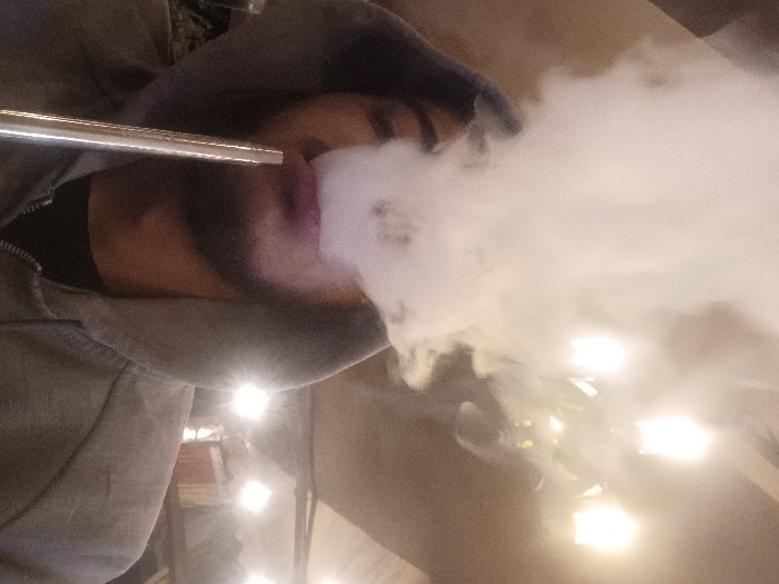 A person wearing a gray hoodie is exhaling a large cloud of white smoke. A metallic tube is near their lips. The smoke obscures the person's face. The background features soft lighting and blurred shapes, possibly indoor plants. The image is slightly rotated.