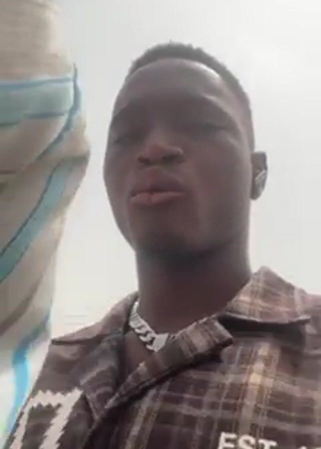 close-up of a young, dark-skinned man wearing a brown and tan plaid shirt with "EST. 1986" printed on it and a silver chain. The camera appears to be handheld, facing the man, as he looks at the camera and possibly speaks. The background is a hazy white, suggesting an overcast day. At several points, another person in a white and blue striped shirt passes in front of the camera, partially obscuring the man's face. The environment appears to be outdoors, potentially near a road, with glimpses of buildings or trees visible. The sound is dominated by wind noise.